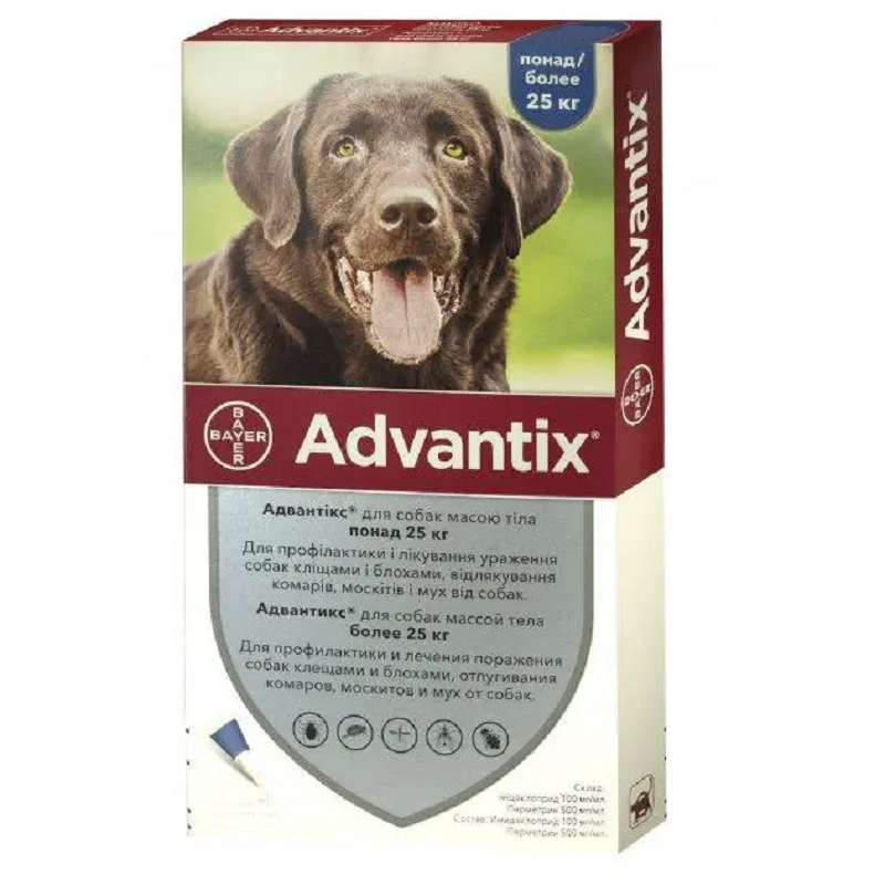 Bayer Advantix (Адвантикс) – комбинированный инсекто-акарицидный препарат для собак, тройная защита против клещей, блох и комаров.