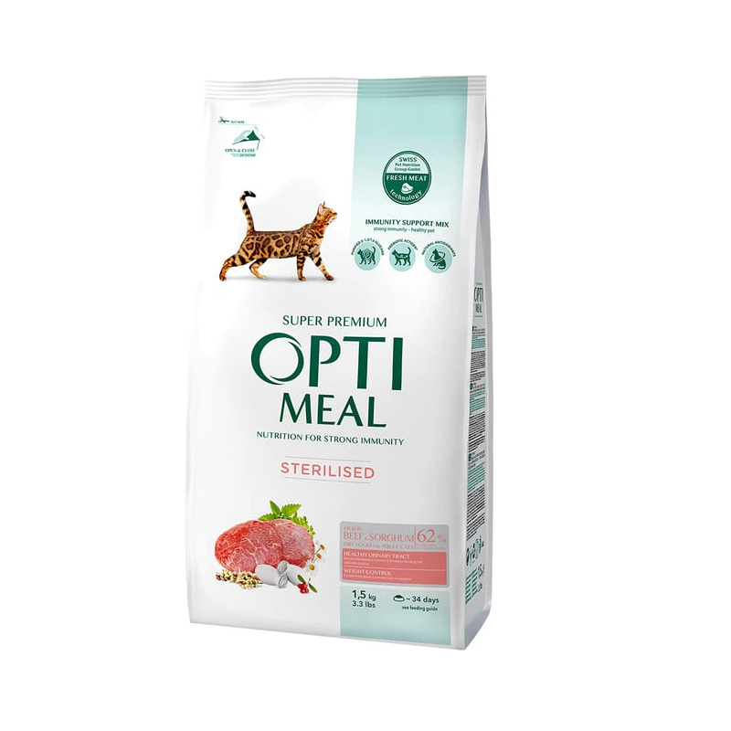 Купить Optimeal Cat Adult Sterilised Beef & Sorghum – полнорационный сухой корм с высоким содержанием говядины и сорго для стерилизованных и кастрированных кошек. Помогает укрепить иммунитет питомца, сохранить здоровье его мочеполовой системы, а также поддерживать оптимальный вес при особых потребностях его организма.
